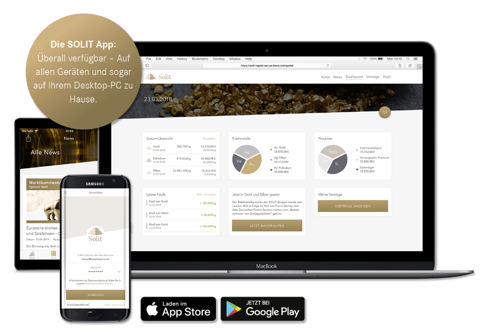 Mit der SOLIT App sind Sie als Edelmetallliebhaber jederzeit und überall informiert – ob Kurse oder Neuigkeiten rund um Edelmetalle und Märkte. Mit der kostenlosen SOLIT App haben Sie zukünftig alles zentral im Blick – und das nicht nur in Ihren eigenen vier Wänden, sondern sogar jederzeit von unterwegs.